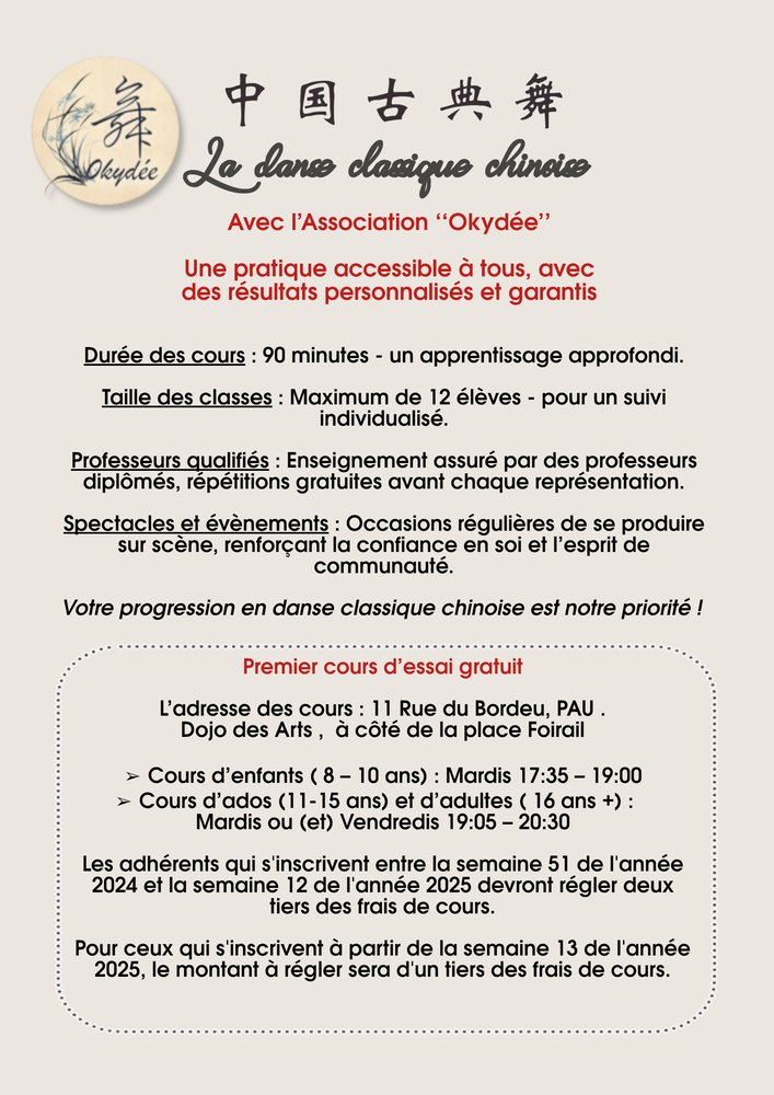 - Un certificat médical de non contre-indication à la pratique de la danse classique chinoise est recommandé
